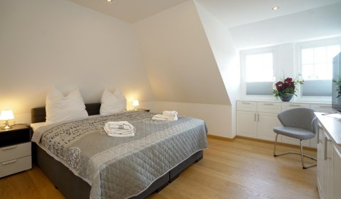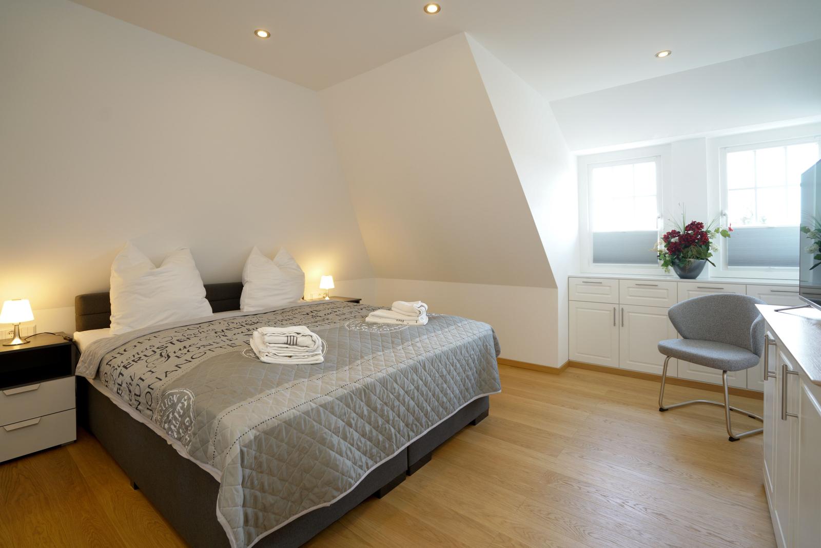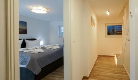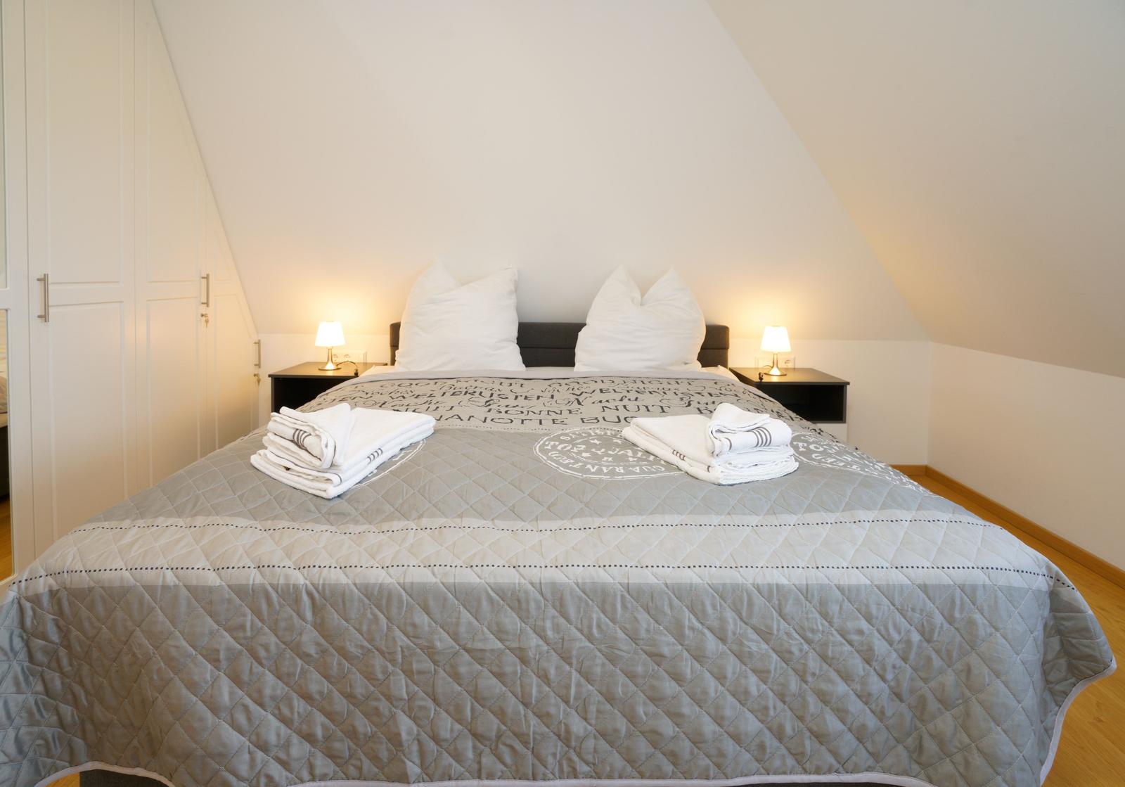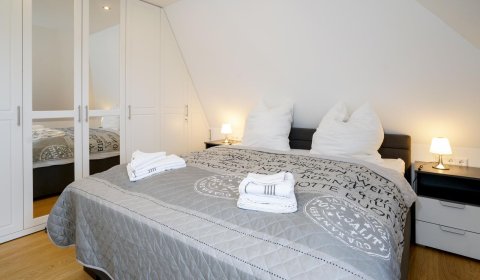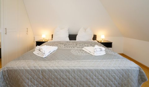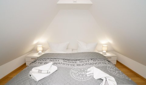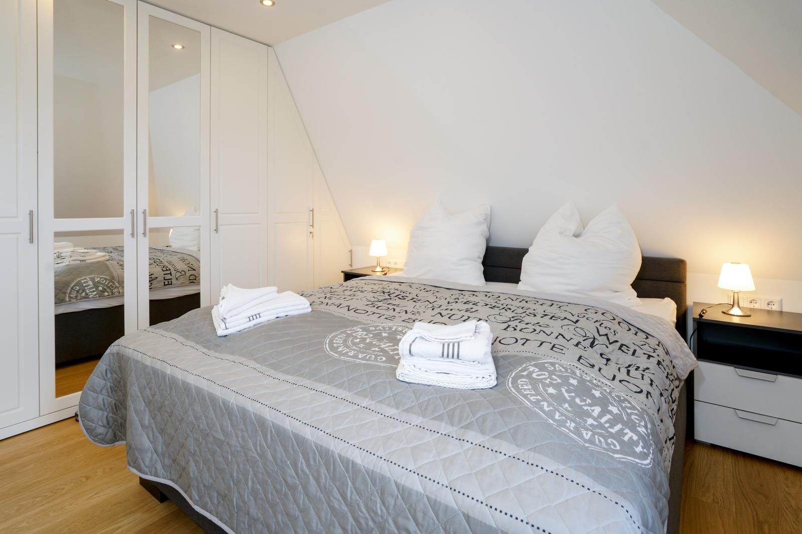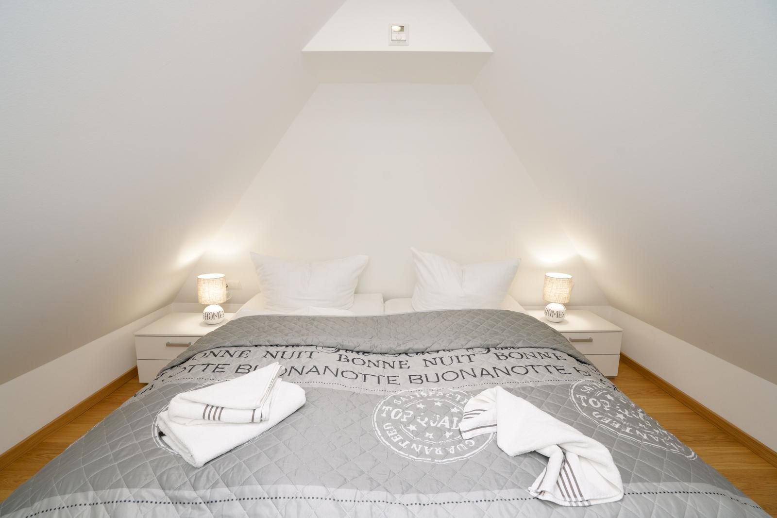 Vom Wohnzimmer aus gelangt man über eine Treppe mit beleuchteten Stufen ins Obergeschoß. Dort befindet sich ein Schlafzimmer mit Doppelbett und Fenster nach Süden, ebenso und ein hochwertig ausgestattetes Bad mit Regen-Dusche, Badewanne und Bidet. Über den Flur kommt man über eine weitere Treppe in die Mansarde, die mit einem weiteren Doppelbett einen vollwertigen Schlafplatz für bis 2 Personen bietet. Frischluftzufuhr bekommen sie oben über ein elektrisches Fenster im Dach.