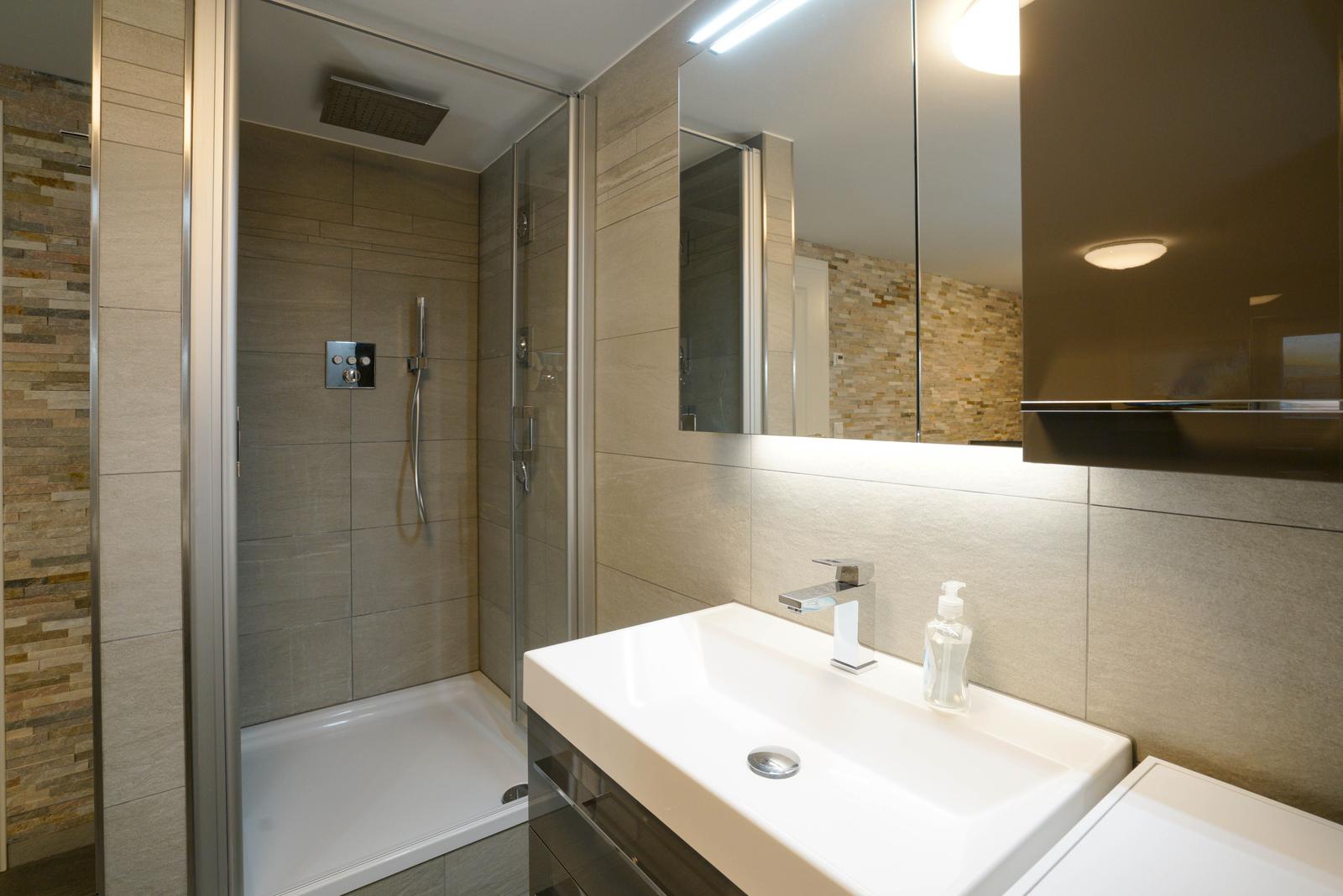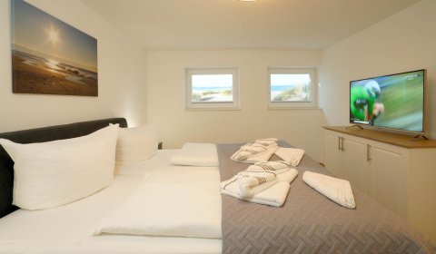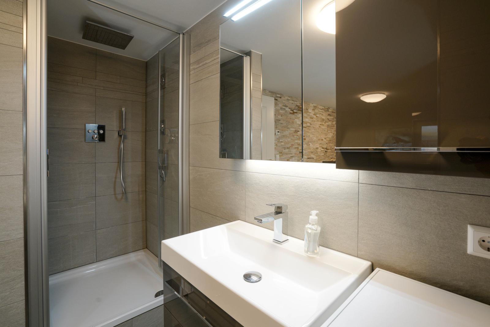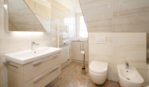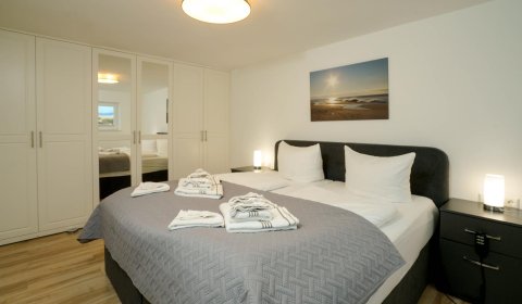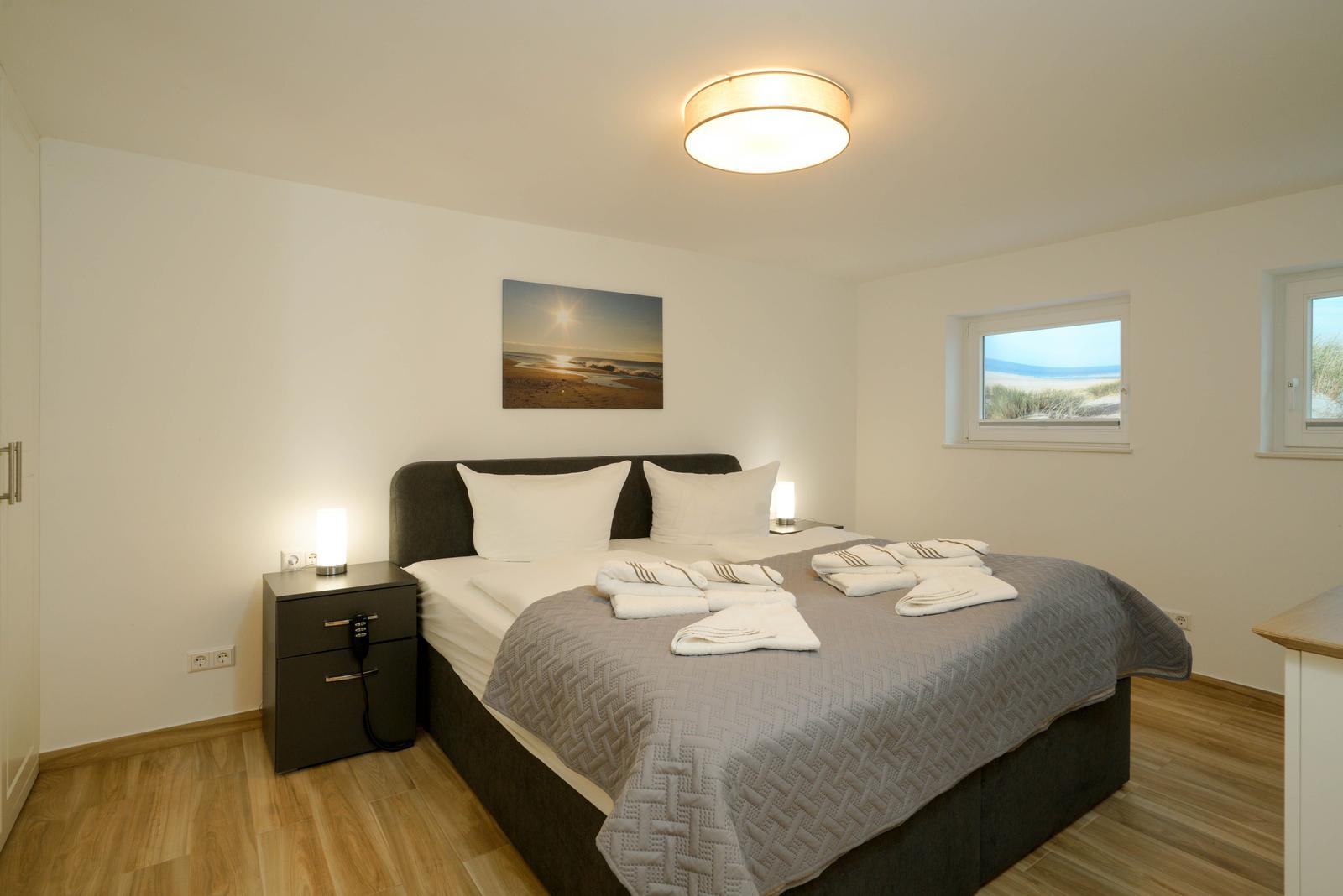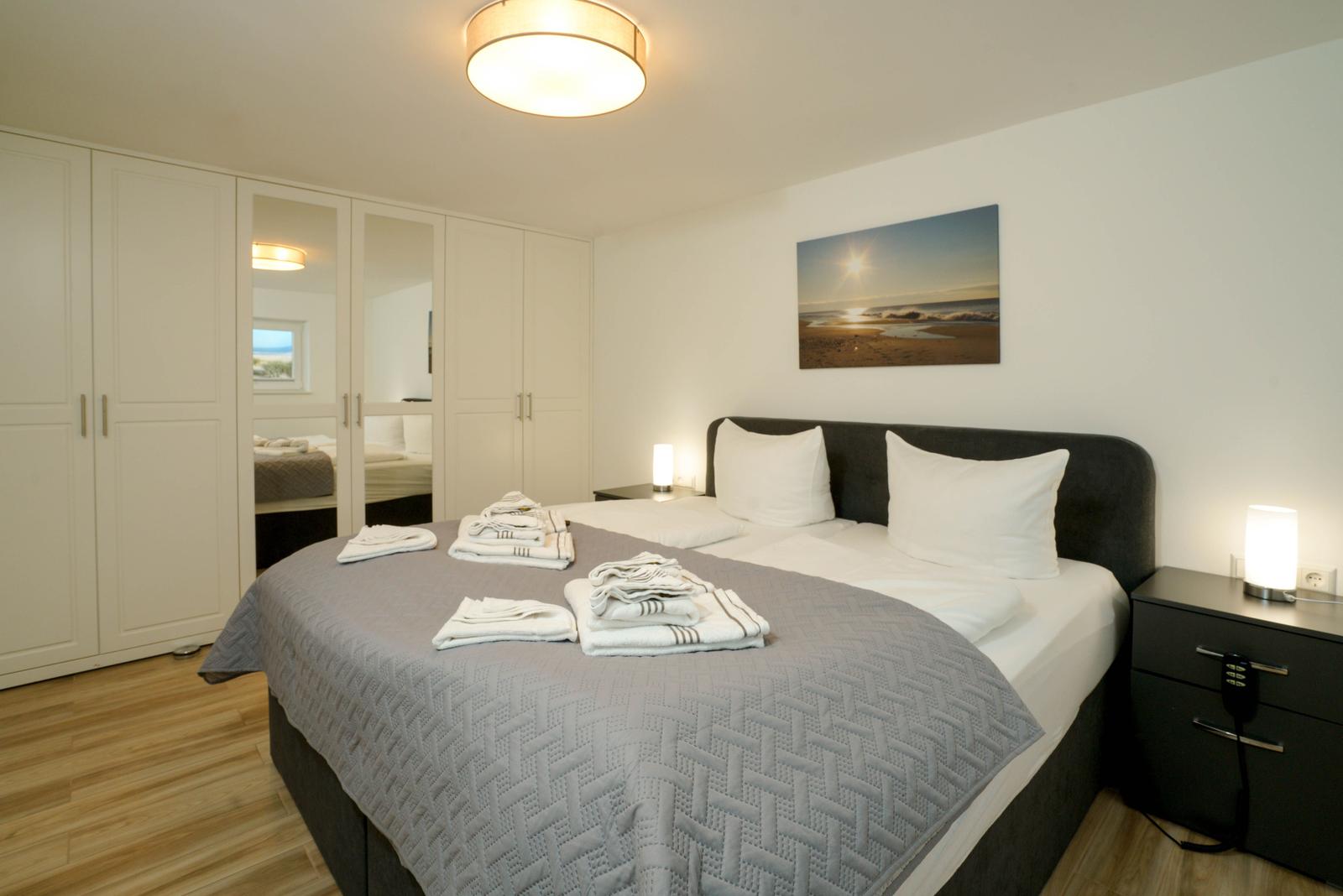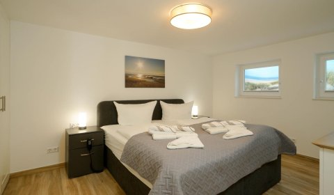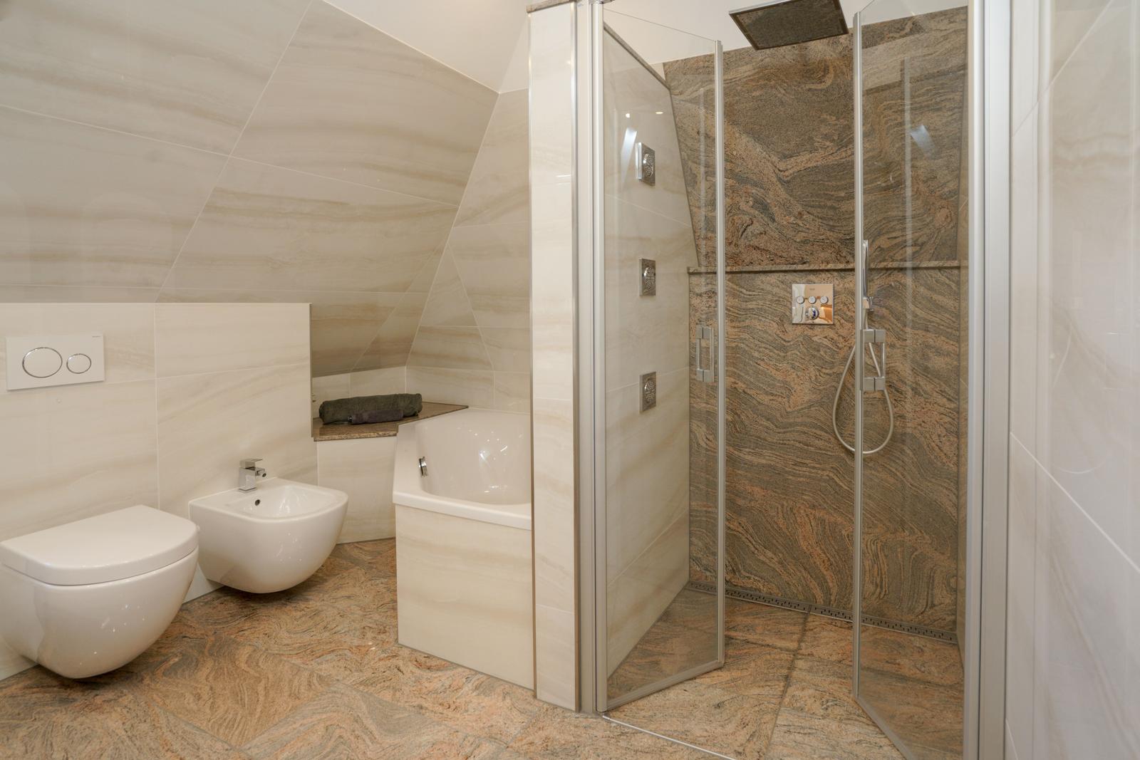 Vom Wohnzimmer aus gelangt man über eine Treppe mit beleuchteten Stufen ins Obergeschoß. Dort befindet sich ein Schlafzimmer mit Doppelbett und Fenster nach Süden, ebenso und ein hochwertig ausgestattetes Bad mit Regen-Dusche, Badewanne und Bidet. Über den Flur kommt man über eine weitere Treppe in die Mansarde, die mit einem weiteren Doppelbett einen vollwertigen Schlafplatz für bis 2 Personen bietet. Frischluftzufuhr bekommen sie oben über ein elektrisches Fenster im Dach.