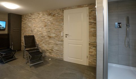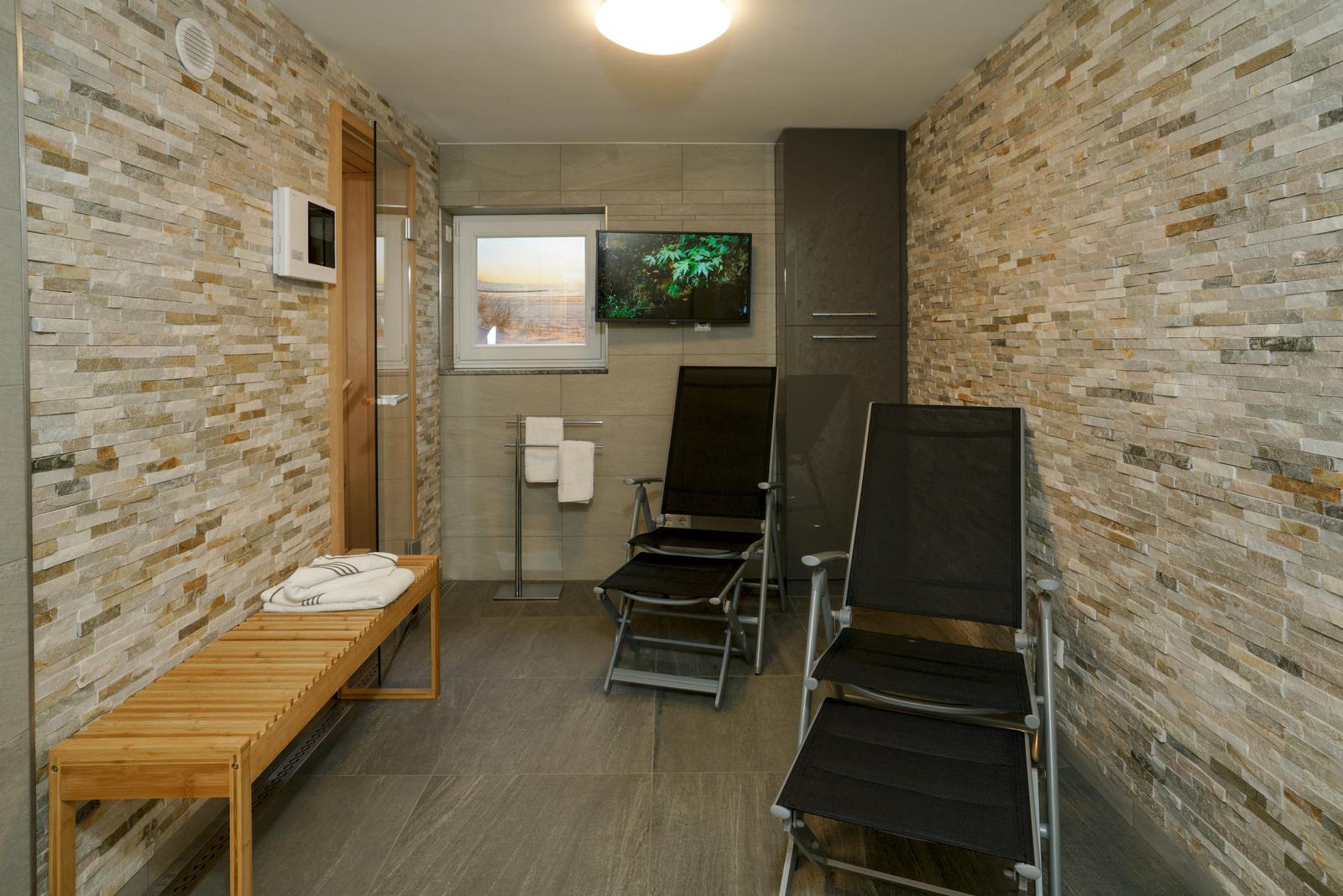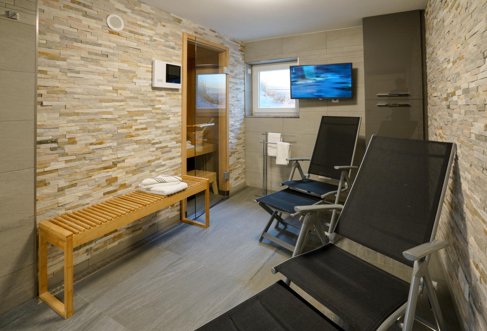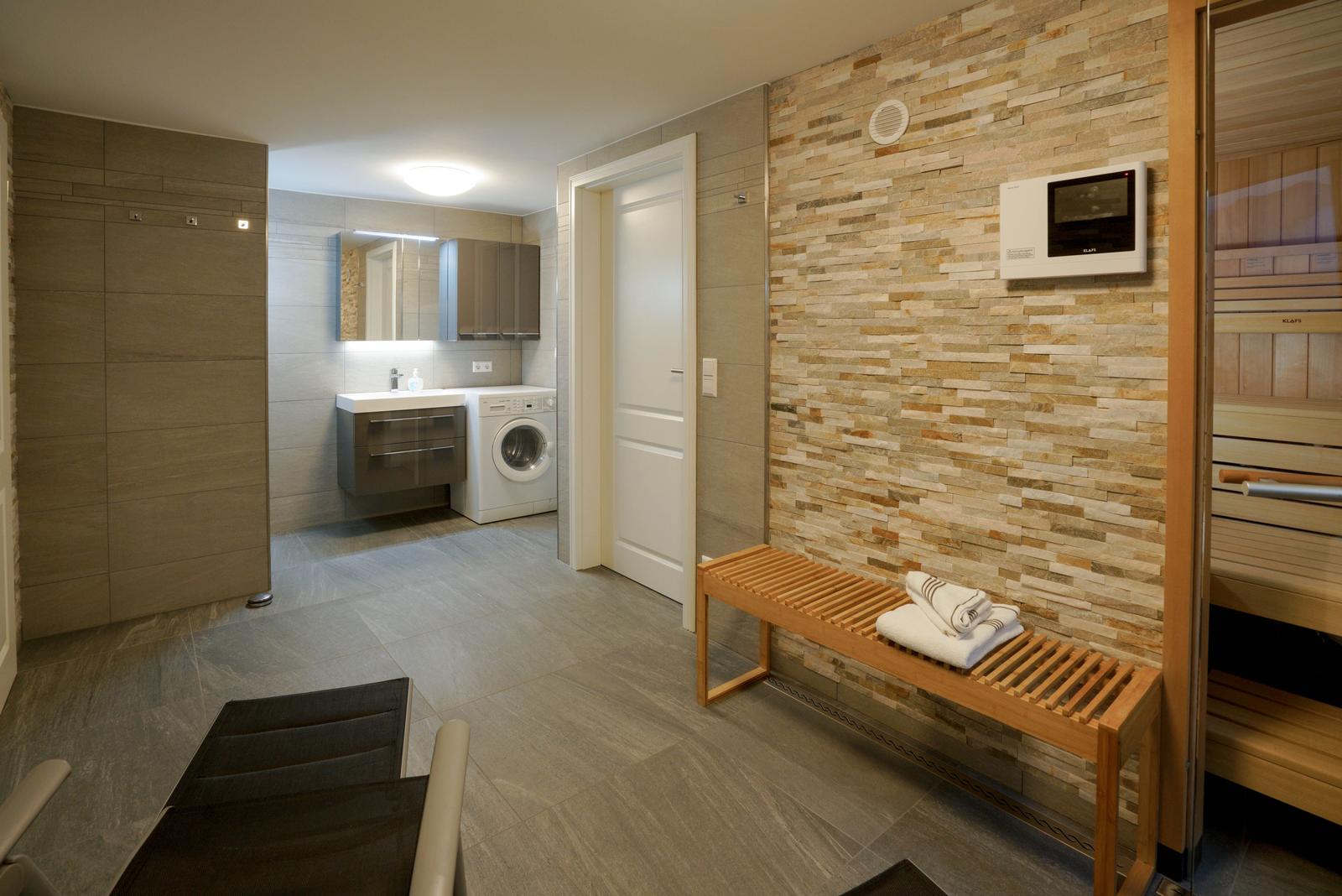 Im Untergeschoß gibt es eine weitere Möglichkeit für 2 Personen in einem Doppel-Schlafzimmer es sich gemütlich zu machen. Dort befindet sich auch der Spa-Bereich mit einer Sauna, einer zusätzliche Regen-Dusche und noch einem WC.