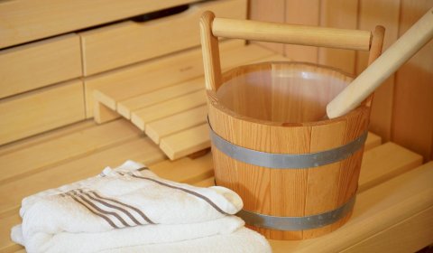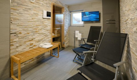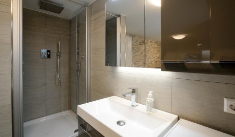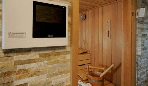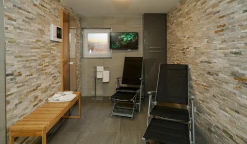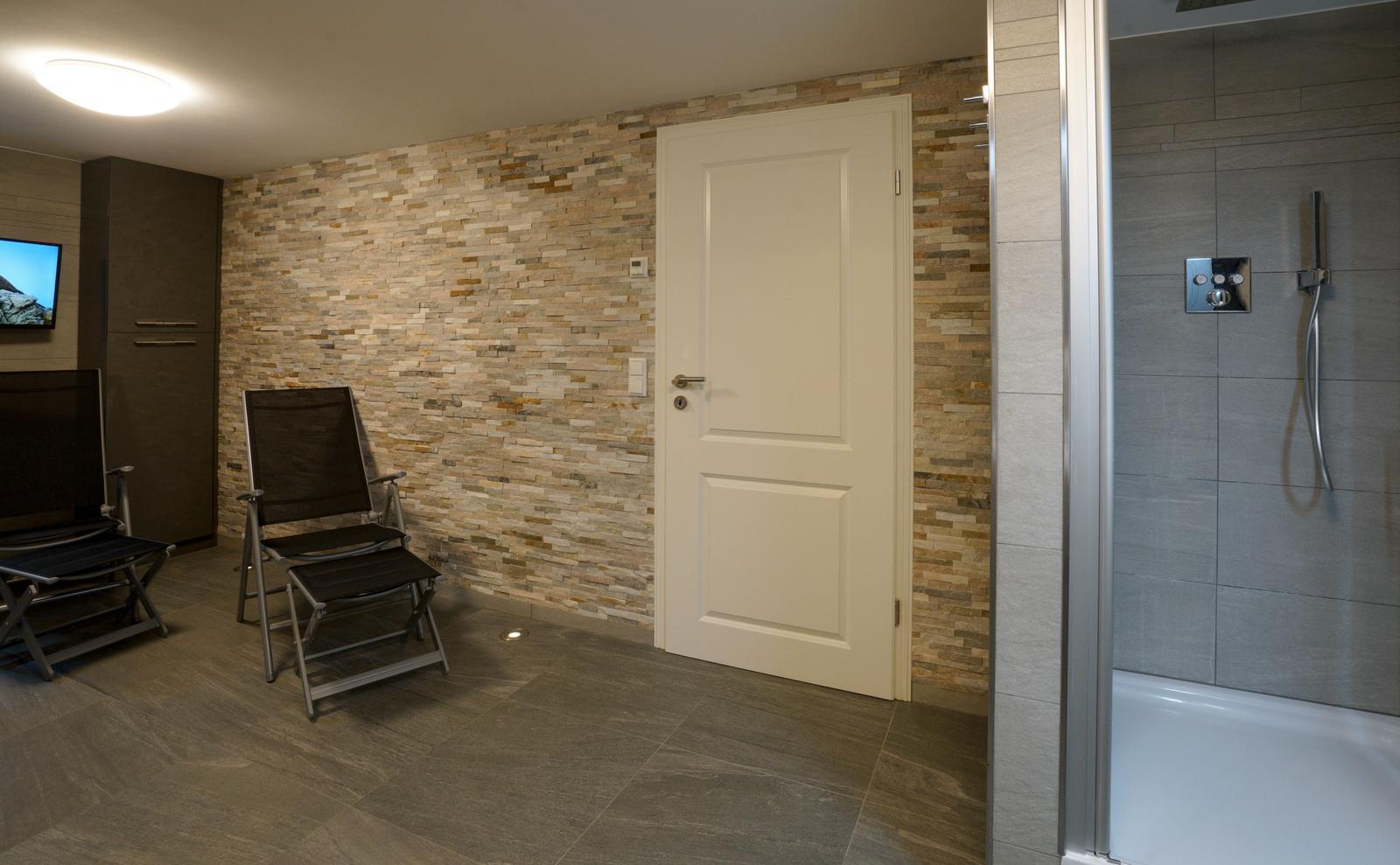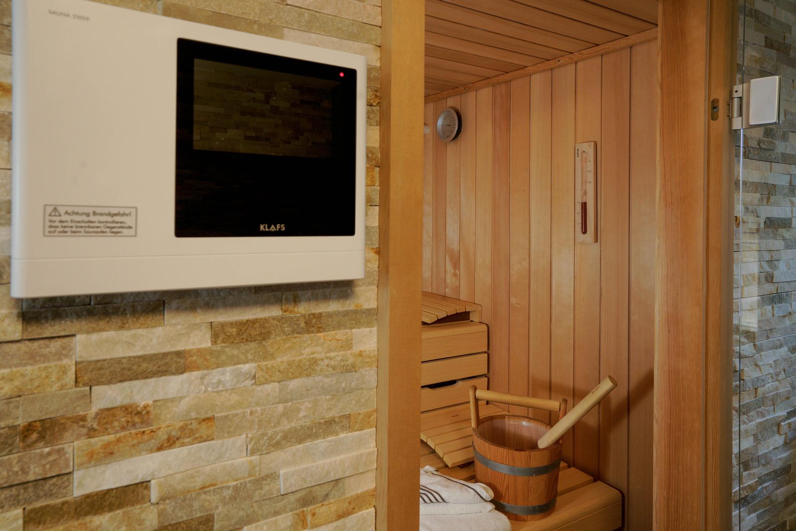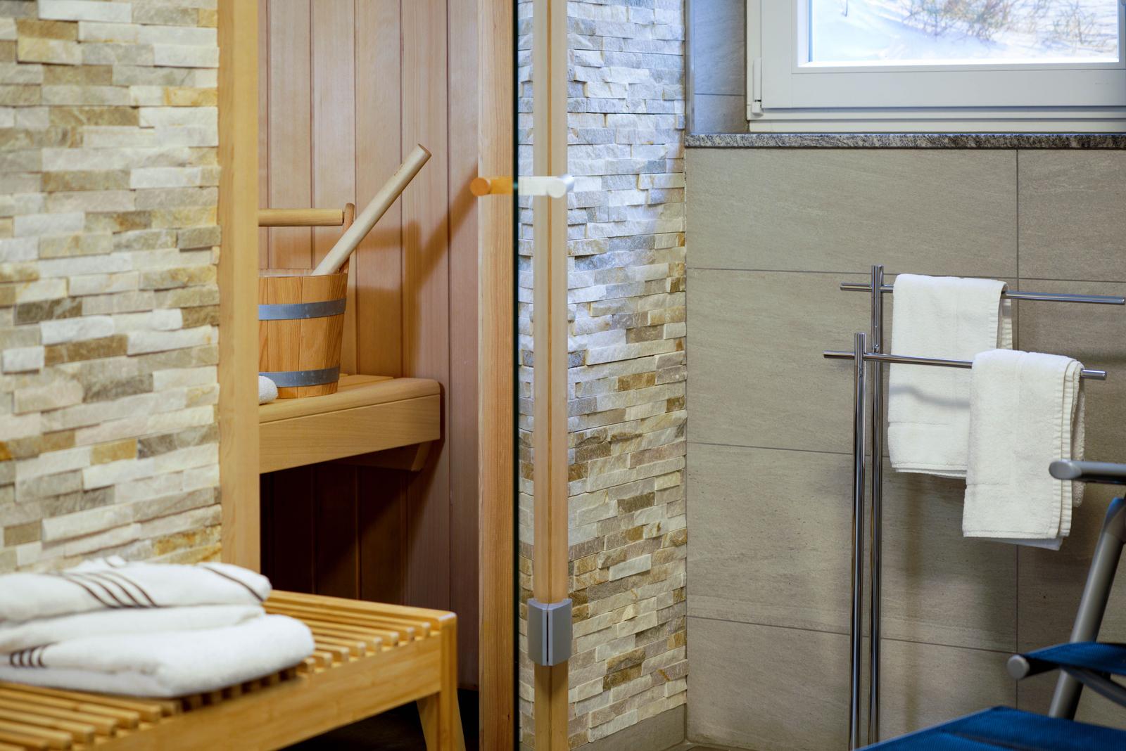 Im Untergeschoß gibt es eine weitere Möglichkeit für 2 Personen in einem Doppel-Schlafzimmer es sich gemütlich zu machen. Dort befindet sich auch der Spa-Bereich mit einer Sauna, einer zusätzliche Regen-Dusche und noch einem WC.