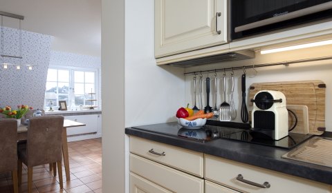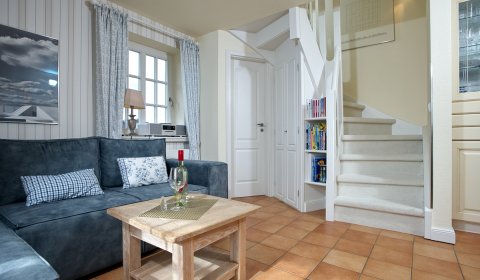 Die Wohnfläche verteilt sich über zwei Ebenen. Im Obergeschoss befindet sich der neu gestaltete Wohnbereich mit separater Küchenzeile und das Duschbad mit ebenerdiger Dusche. Einbauschränke in der Wohnung bieten ausreichend Möglichkeiten zur Unterbringung Ihres Gepäcks. Die gesamte Wohnung wurde von den Eigentümern mit viel Liebe zum Detail neu gestaltet.