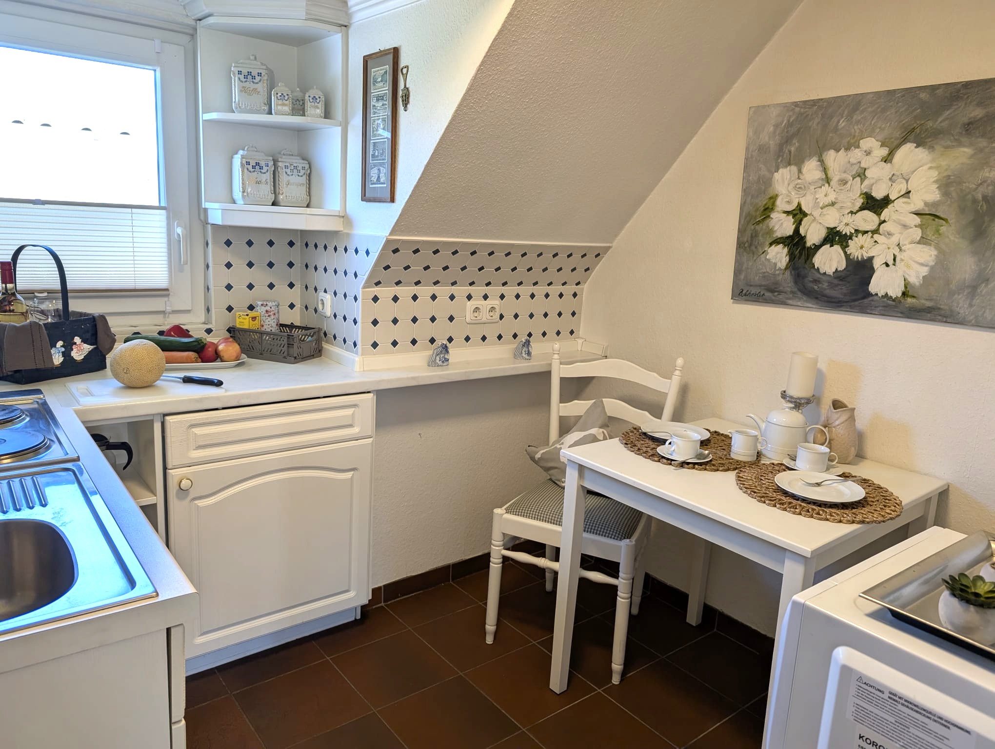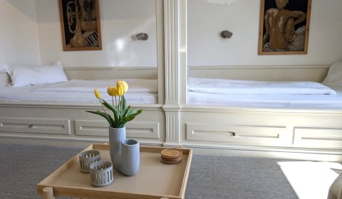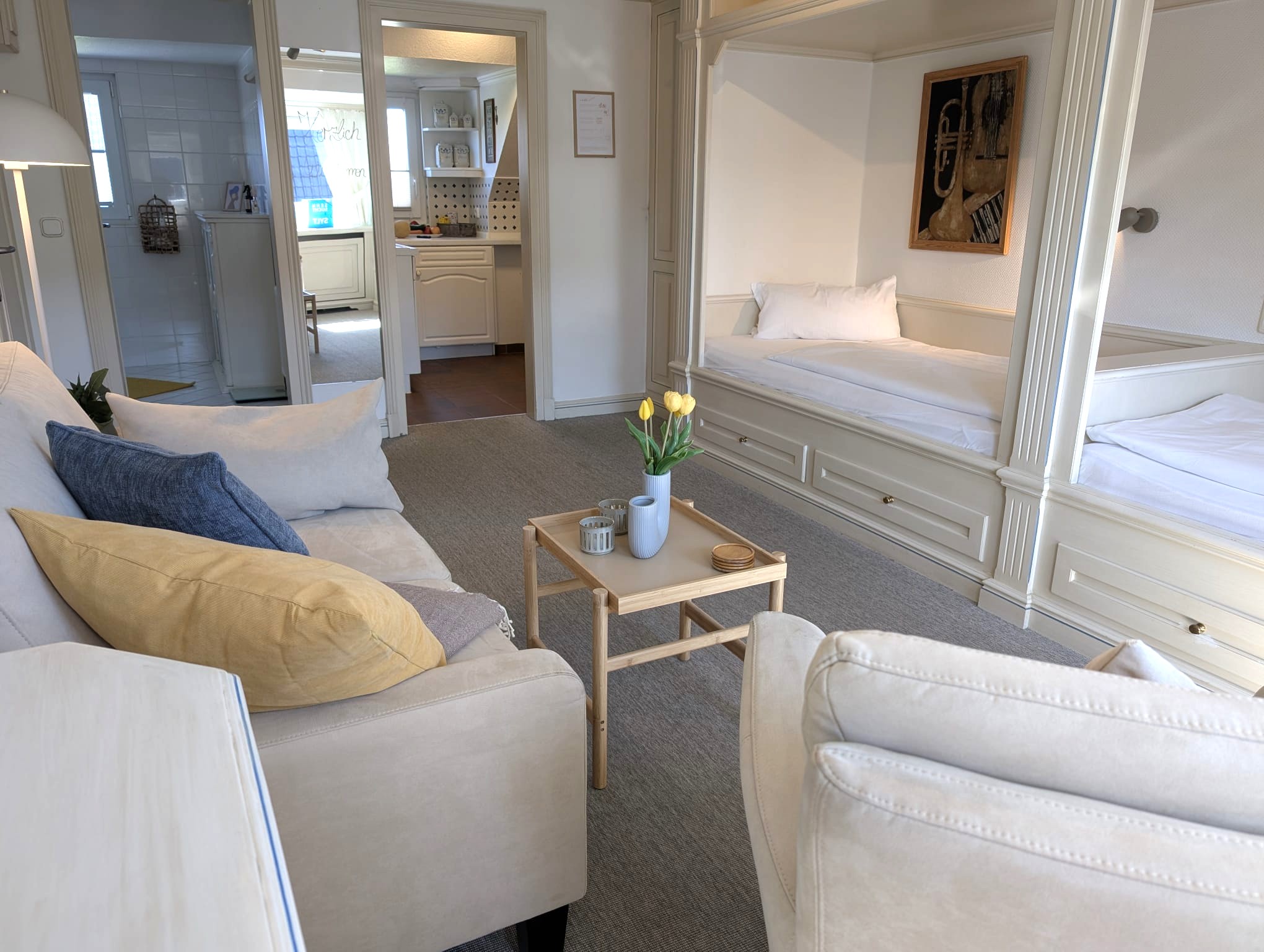 Das gemütliche und liebevoll eingerichtete Appartement besteht aus einem Wohn-/Schlafraum mit Alkovenbetten, einer komplett ausgestatteten Küche mit Essecke sowie einem Bad mit Dusche/WC. Zusätzlich finden sie einen Farb-TV mit Kabelanschluss sowie Radio, Haartrockner und Bügeleisen. Wlan vorhanden ( ohne Gewähr). Haustiere sind nicht gestattet.