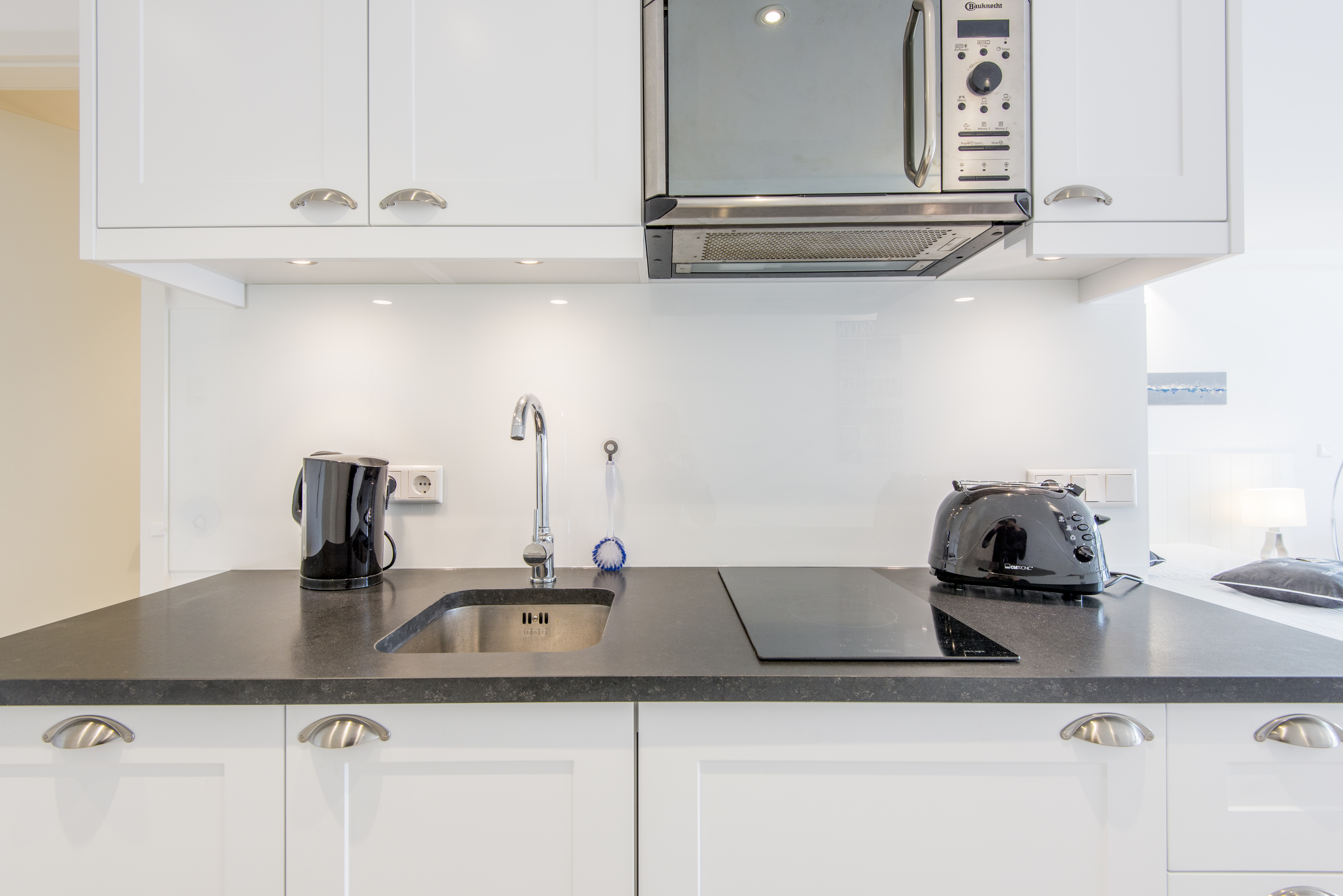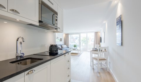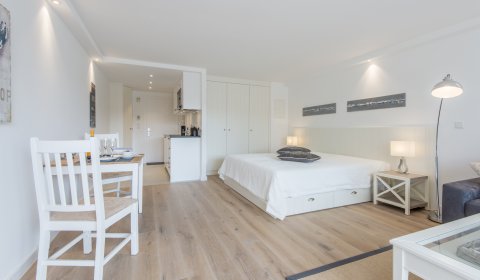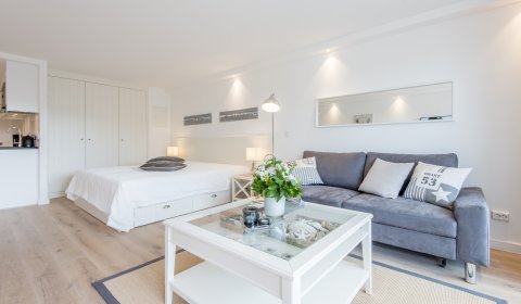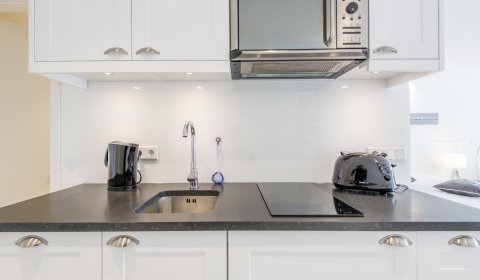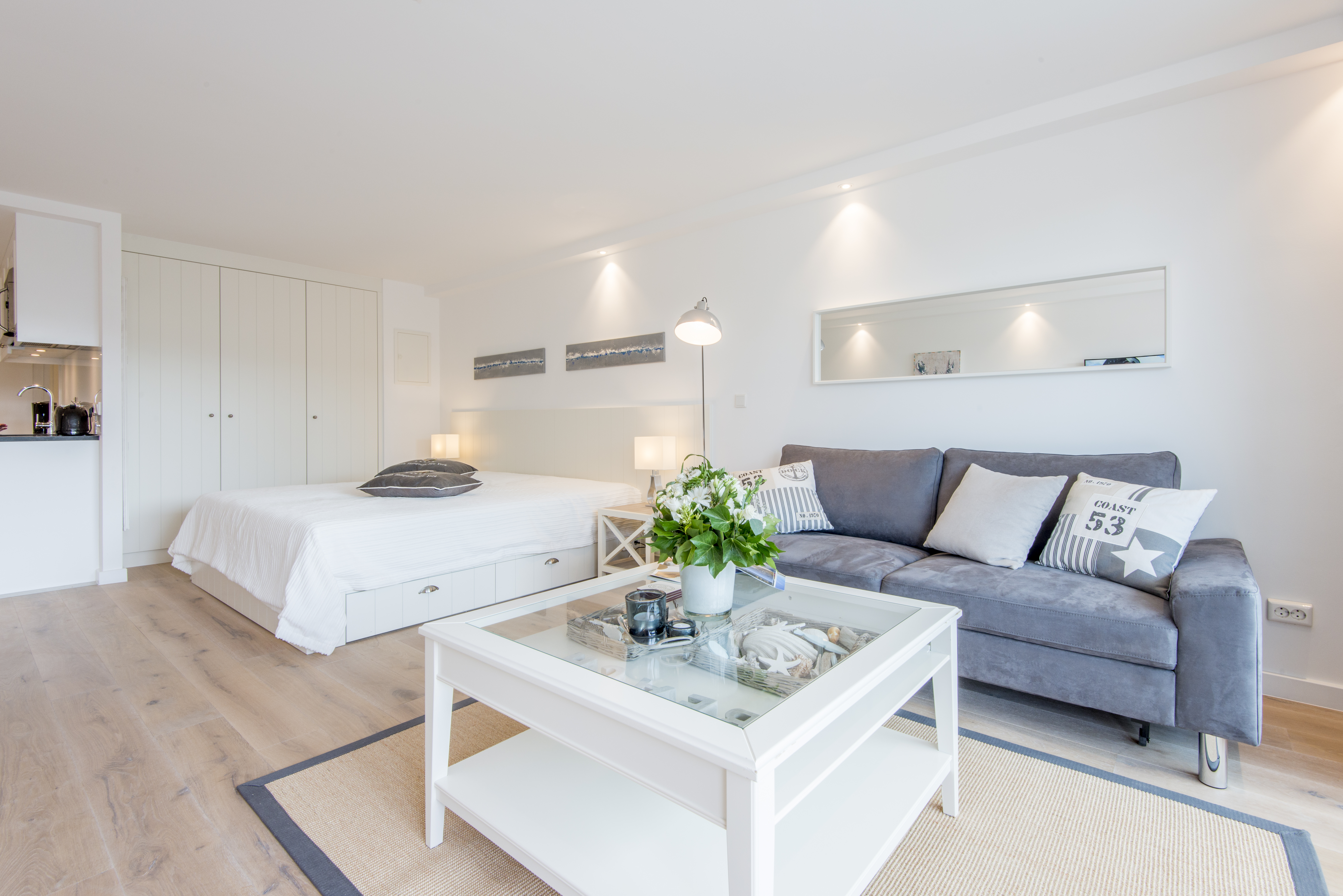 Beim Betreten der Wohnung befindet sich im Eingangsbereich eine moderne Küche. Diese ist ausgestattet mit einem Geschirrspüler, einer Mikrowelle und einem 2-Platten-Cerankochfeld, sodass das Zubereiten von Mahlzeiten komfortabel möglich ist. Der großzügige Wohnbereich bietet einen Essplatz für zwei Personen und ist zudem mit einem Kingsize-Bett von 2x 90cm Breite und 200cm Länge ausgestattet, sodass es für erholsamen Schlaf sorgt. Ein großer Einbauschrank bietet ausreichend Stauraum, während ein gemütliches Sofa zum Entspannen einlädt.