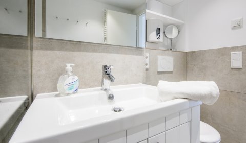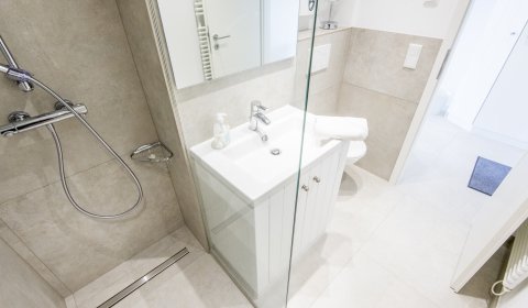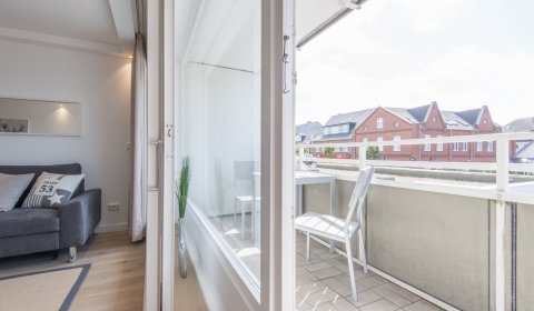 Das Badezimmer überzeugt durch hochwertige Armaturen und eine Duschbad-WC-Kombination. Zusätzlich sorgt eine Handtuchheizung für warme Handtücher und ein behagliches Raumgefühl. Vom Wohnzimmer aus gelangt man auf den Westbalkon, der mit einem Tisch und Stühlen bestückt ist und somit eine angenehme Outdoor-Ebene zum Frühstück oder Entspannen bietet.