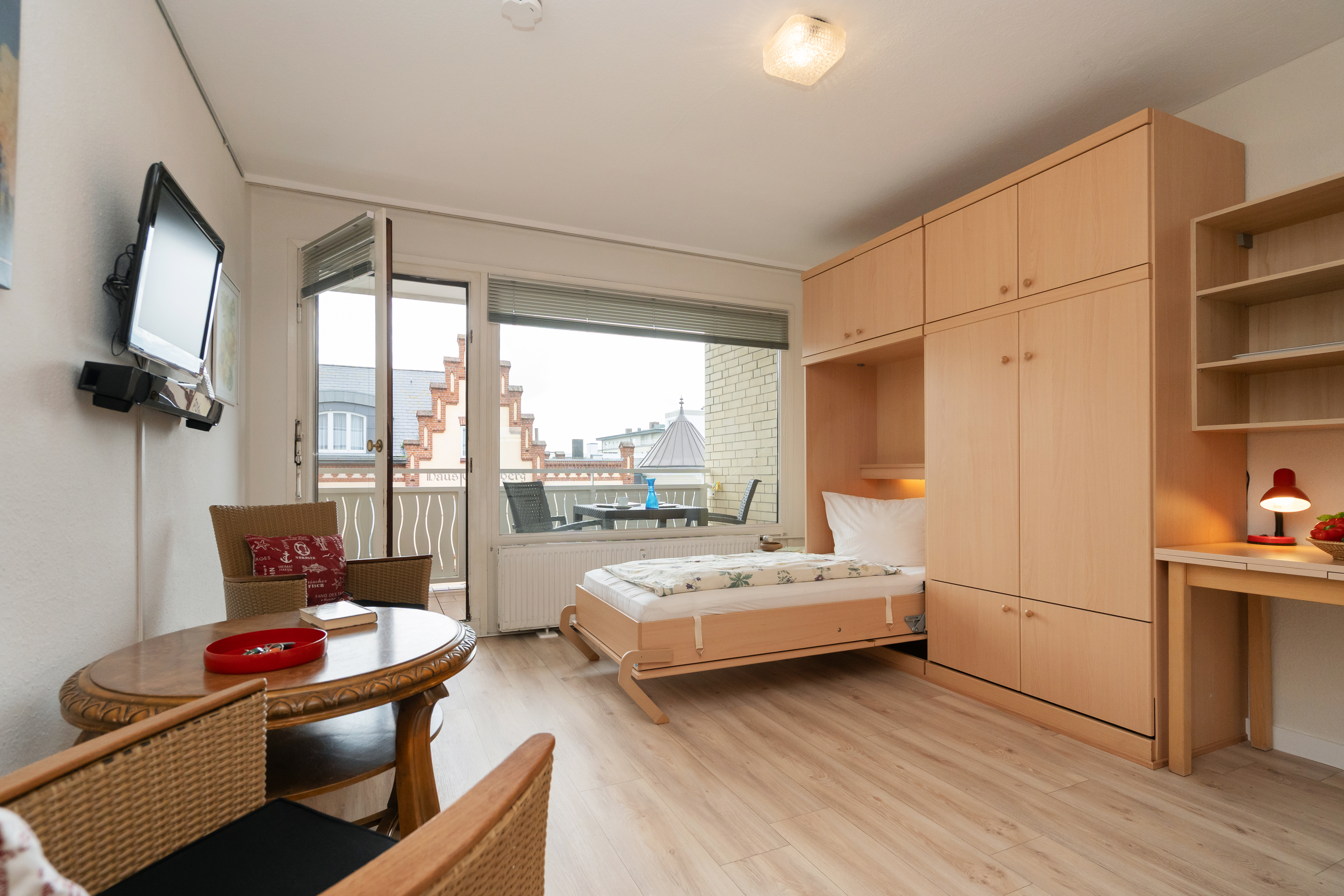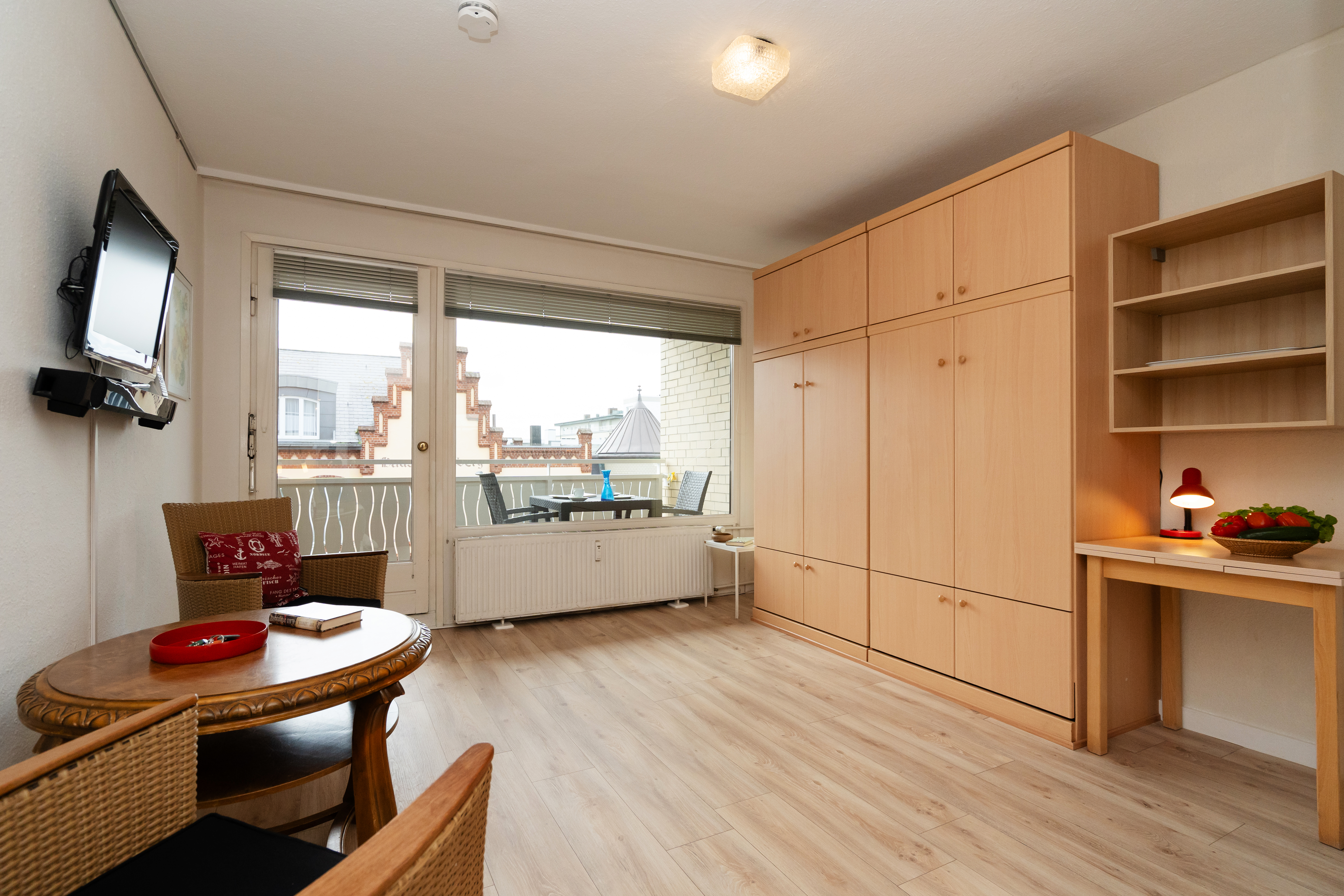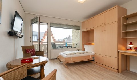 Geflegte 1 Zimmer Wohnung zentral gelegen im Haus Christianenhöhe. Der Eingangsbereich ist mit einem geräumigen Kleiderschrank inklusive Spiegel ausgestattet, dieser bietet ausreichend Stauraum für Kleidung, Schuhe und Utensilien. Der komfortable Wohnbereich verfügt über ein praktisches Schrankbett ( einzelnt klappbar), das sich bei Bedarf bequem ausklappen lässt und tagsüber zusätzlichen Platz schafft. Zwei Stühle und ein kleiner Tisch ermöglichen eine gemütliche Sitzecke zum Essen, Lesen oder Arbeiten. Die offene Küche ist mit einem 2 Platten Cerankochfeld und einer Mikrowelle ausgestattet – ideal für schnelle Mahlzeiten oder Kaffee am Morgen. Das Badezimmer verfügt über eine Dusche mit hohem Einstieg und einer Handtuchheizung, die für eine angenehme Wohlfühltemperatur im Raum sorgt. Der Balkon ist südlich ausgerichtet und bietet einen Blick auf den Innenstadtbereich. Kein PKW Stellplatz. Haustiere sind nicht gestattet.