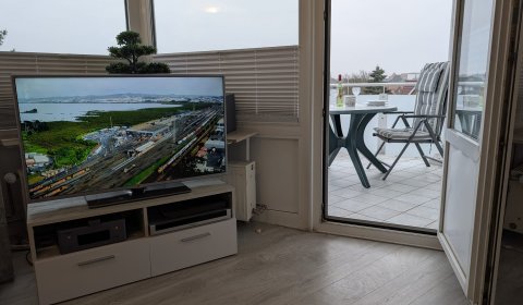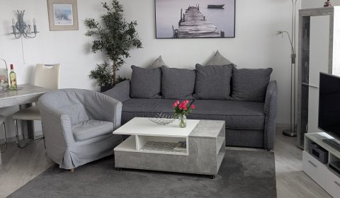 Die ca. 40 m² große Wohnung befindet sich in der 3. Etage und ist ideal für maximal 3 Personen geeignet. Der kombinierte Wohn- und Schlafraum sorgt für eine großzügige, wohnliche Atmosphäre. Der Wohnbereich verfügt über ein bequemes Ausziehsofa und einen Sessel sowie einen Esstisch mit Platz für drei Personen.