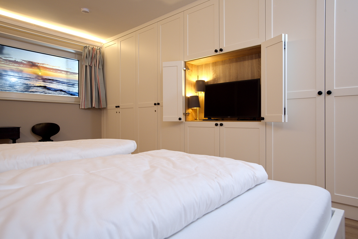 Im Untergeschoss befindet sich ein gemütliches Schlafzimmer mit Doppelbett ( 200 x 200), das mit einem TV und einem großen Einbaukleiderschrank ausgestattet ist  ideal für erholsame Nächte.