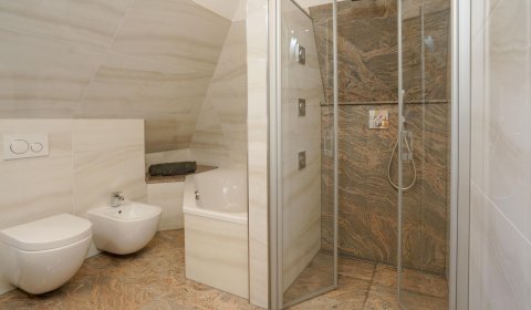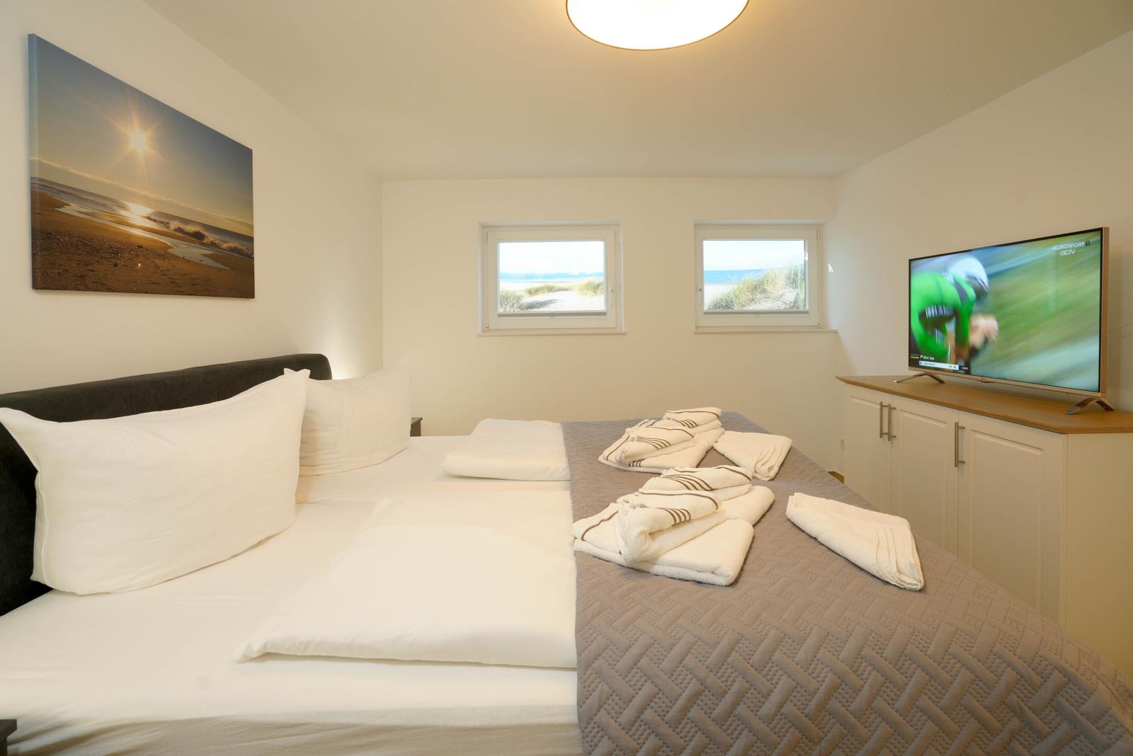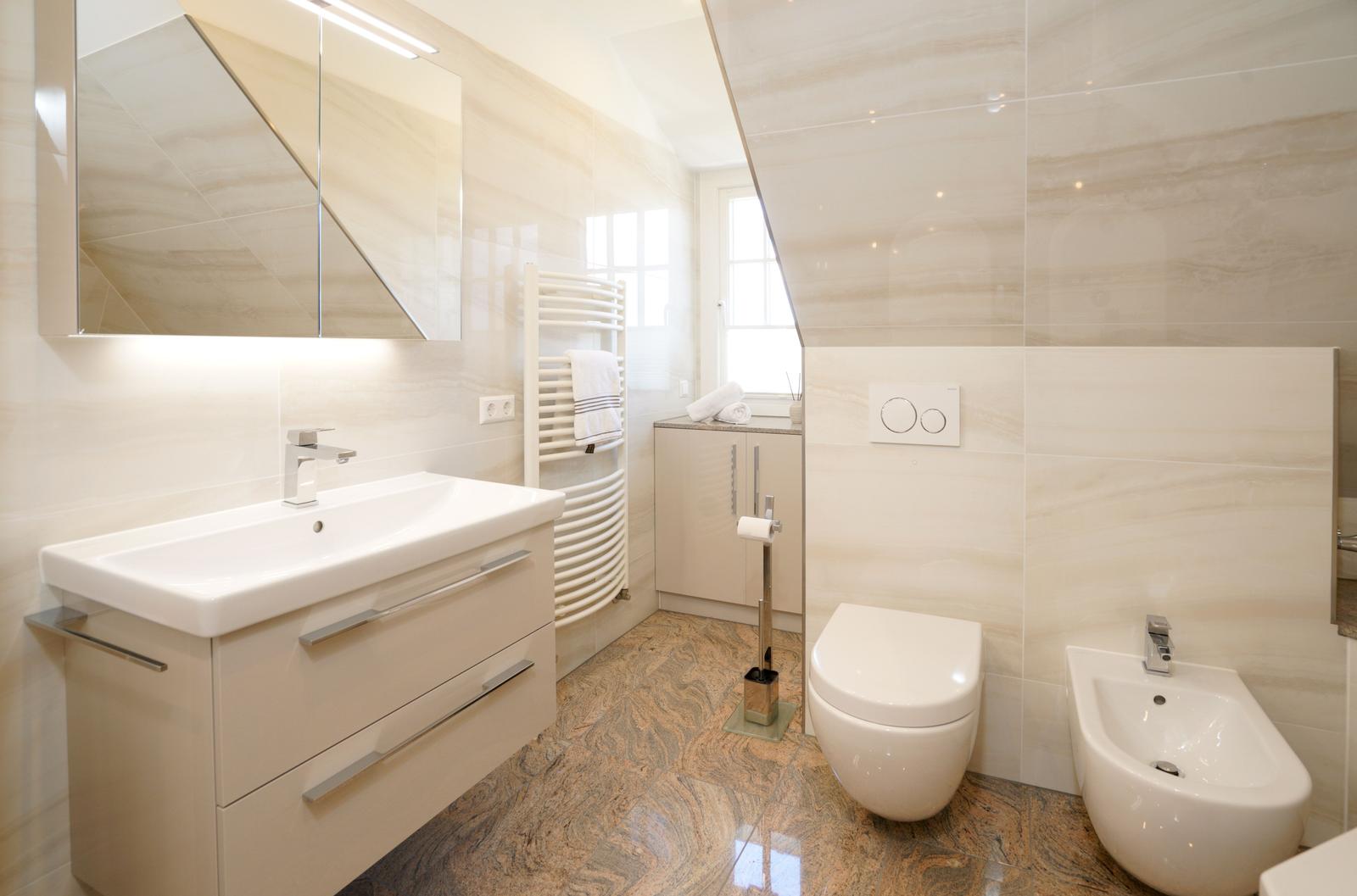 Vom Wohnzimmer aus gelangt man über eine Treppe mit beleuchteten Stufen ins Obergeschoß. Dort befindet sich ein Schlafzimmer mit Doppelbett und Fenster nach Süden, ebenso und ein hochwertig ausgestattetes Bad mit Regen-Dusche, Badewanne und Bidet. Über den Flur kommt man über eine weitere Treppe in die Mansarde, die mit einem weiteren Doppelbett einen vollwertigen Schlafplatz für bis 2 Personen bietet. Frischluftzufuhr bekommen sie oben über ein elektrisches Fenster im Dach.