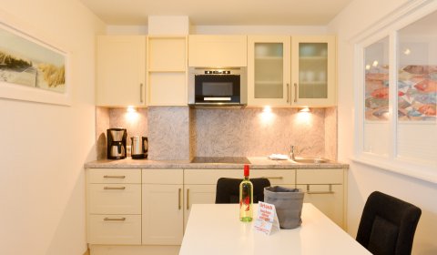 Das Schlafzimmer ist mit einem bequemen Boxspringbett ausgestattet und verfügt über einen TV sowie einen Kleiderschrank, der ausreichend Stauraum bietet. Der separate, offene Küchenbereich ist modern gestaltet und bietet einen Essplatz für 4 Personen. Die Küche ist mit einem Induktionskochfeld, einem Geschirrspüler und einer Mikrowelle mit Backofenfunktion ausgestattet, sodass Sie Ihre Lieblingsgerichte mühelos zubereiten können.