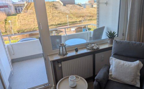 Das kleine Schlafzimmer ist mit zwei Einzelbetten ausgestattet und bietet einen ruhigen Rückzugsort. Das Duschbad mit WC sorgt für zusätzlichen Komfort. Genießen Sie die frische Luft auf dem Balkon, der nach Westen ausgerichtet ist und einen schönen Blick zur Düne sowie zum Schwimmbad "Sylter Welle" bietet.