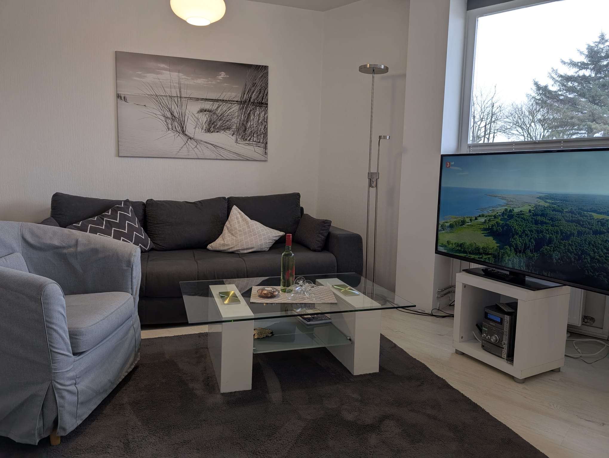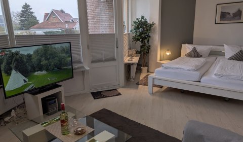 Die ca. 40 m² große Wohnung liegt in der ersten Etage und eignet sich ideal für bis zu drei Personen. Der kombinierte Wohn- und Schlafraum lädt mit einem gemütlichen Ausziehsofa und einem bequemen Sessel zum Relaxen ein, während ein Esstisch Platz für drei Personen bietet. Im Schlafbereich finden Sie ein Doppelbett sowie einen geräumigen Kleiderschrank, sodass Kleidung und Gepäck bequem untergebracht sind.