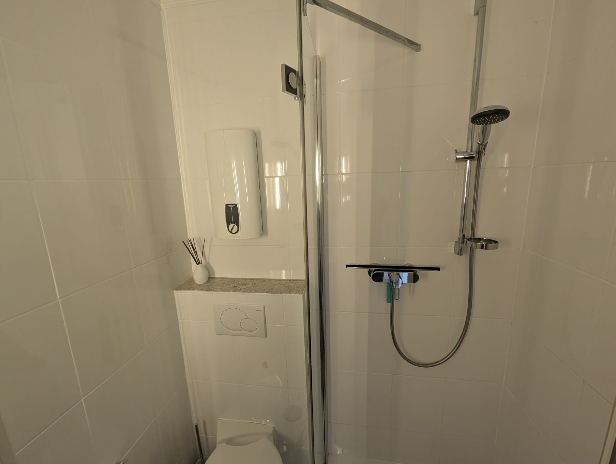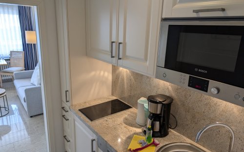 Kleine 1 Zimmer Wohnung mit Doppelschrankbett mit ausreichendem Stauraum und gemütlichem Ausziehsofa. Essplatz für 2 Personen direkt am Fenster . Die vollausgestattete Küche befindet sich im Eingangsbereich und ist mit einem 2 Platten Cerankochfeld, Backofen und Geschirrspüler ausgestattet. Das Badezimmer verfügt über eine Eckdusche. Auf dem Balkon Richtung Osten sind Tisch und Stühle vorhanden. Ihre Fahräder können sie im Keller des Hauses im Fahrradabstellraum unterstellen. PKW Stellplatz gehört nicht zu der Wohnung.