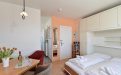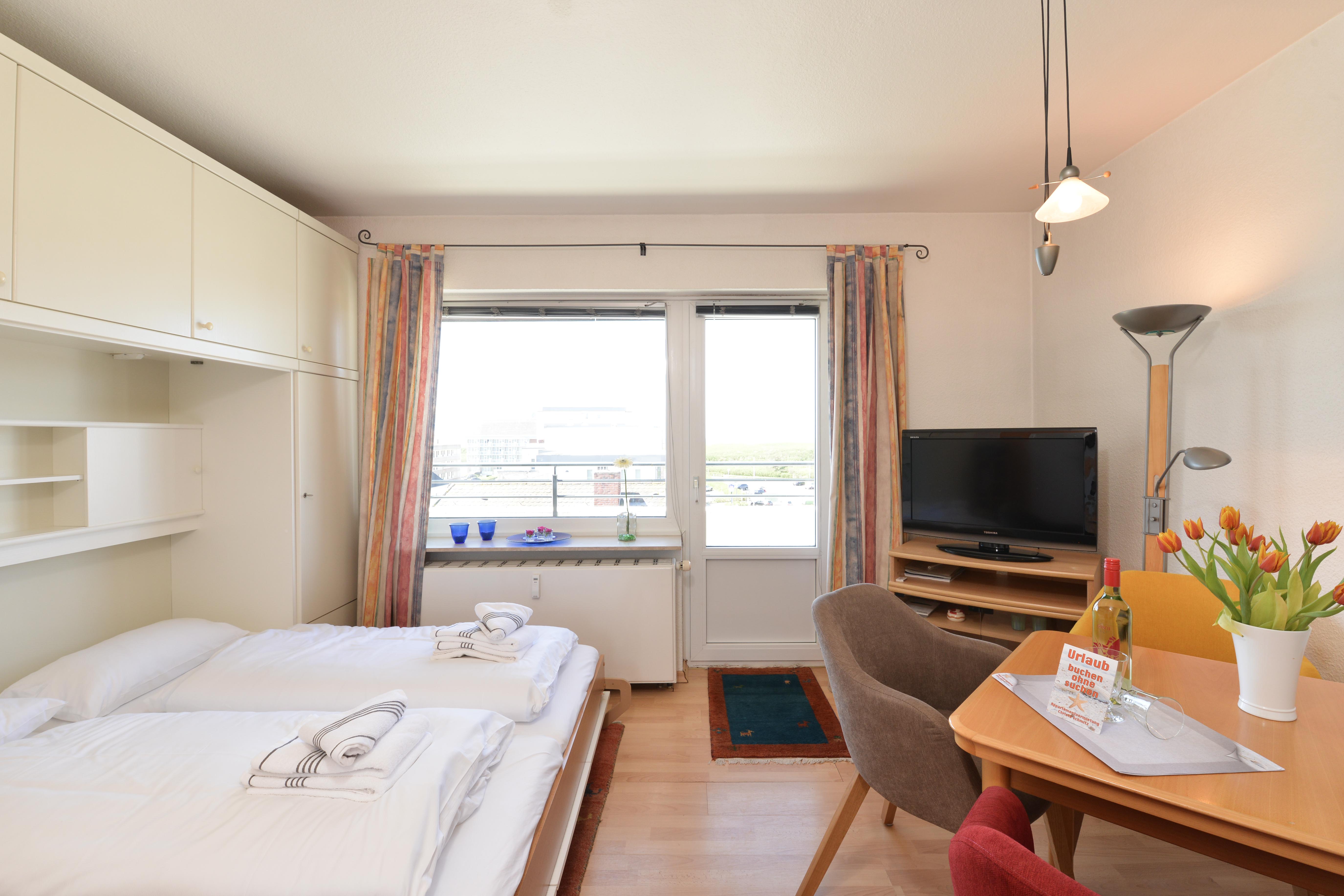 Helles, sonniges 1 Zimmer Appartement im 5. OG mit großem Panorama-Fenster. Der Wohnraum mit pflegeleichtem Laminat, verfügt über ein Schrankbett, einer gemütlichen Essecke, CD-Player, DVD-Player und Farbfernseher.
